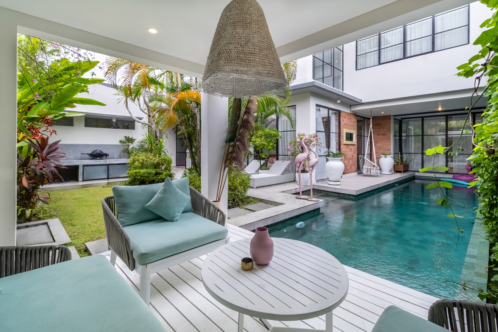 - Private swimming pool surrounded by tropical plants, paired with comfortable loungers and a tranquil outdoor lounge for relaxed afternoons