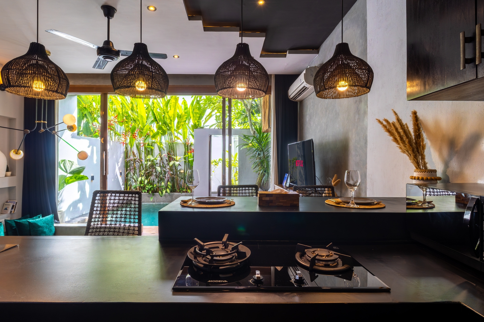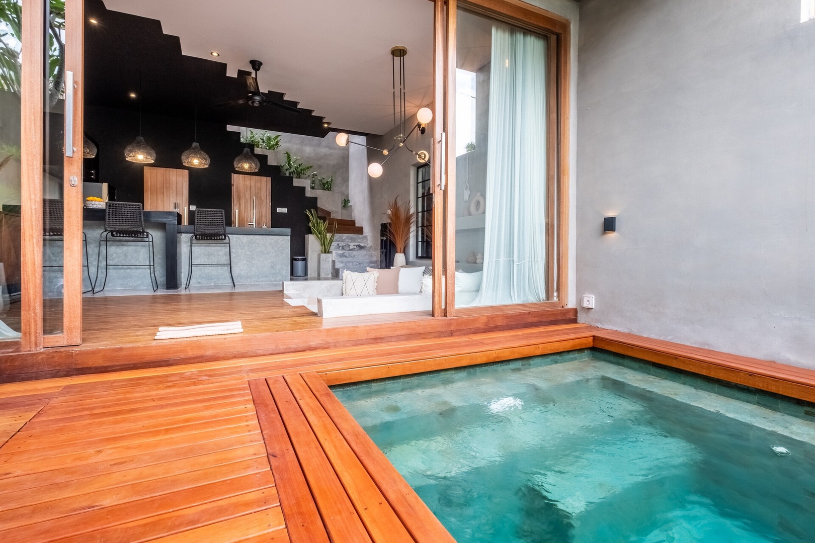 Villa Hebe is yours to enjoy in full—featuring a chic enclosed living room with a sunken couch, a sleek modern kitchen, and a spacious bedroom complete with a dedicated workspace and a stunning ensuite bathroom. Step outside to your private tropical pool, the perfect spot to unwind. With 24/7 online support and a dedicated onsite team—including a villa manager, housekeeper, and garden staff—your comfort is our priority. A refined, luxurious Bali escape awaits.