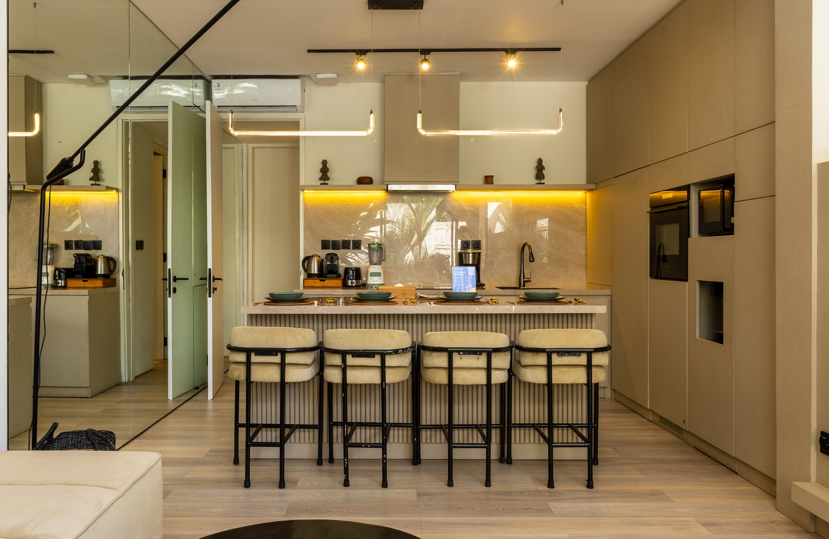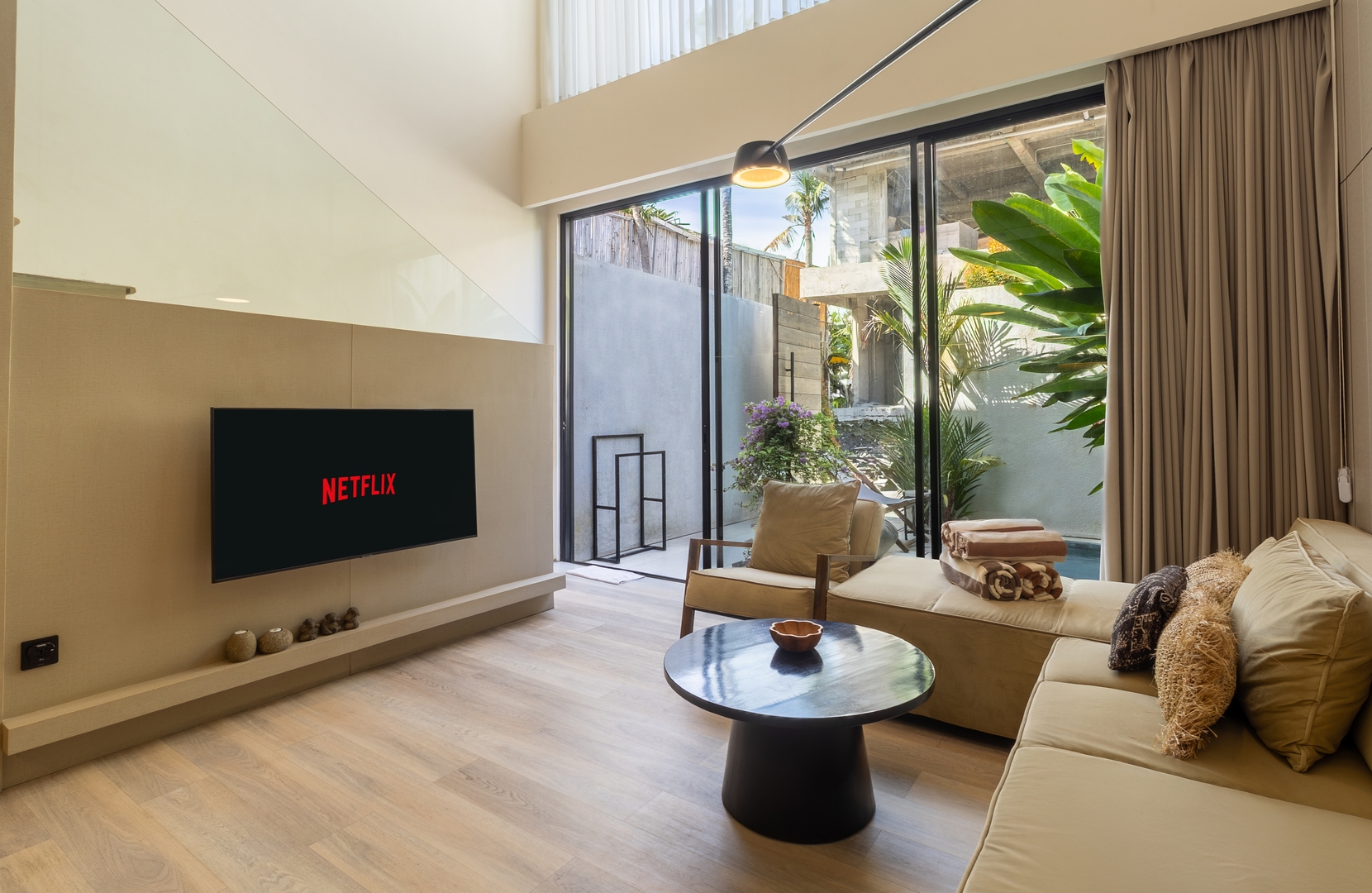 This villa harmoniously combines contemporary sophistication with tropical charm, showcasing high ceilings, soft neutral hues, and a fluid indoor-outdoor layout. Carefully curated lighting and high-quality materials create an inviting atmosphere, while expansive glass doors let in abundant natural light and lead to a private pool.