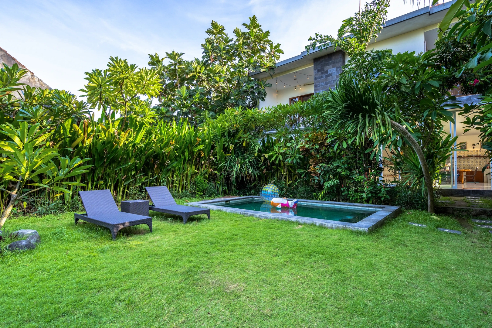 • Private swimming pool surrounded by lush greenery, providing a refreshing escape after exploring Canggu