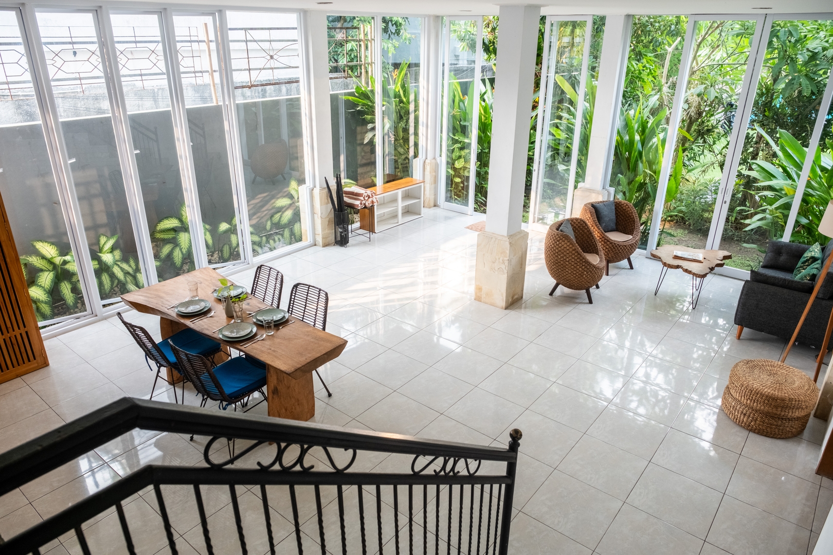 - Enclosed open-plan living room with air conditioning, comfortable lounge seating, and floor-to-ceiling glass doors that flood the space with light while keeping it cool