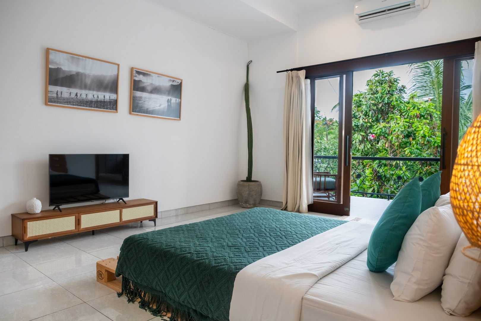 • Three generous bedrooms — two with private balconies and large windows overlooking the pool and garden, each fitted with flat-screen TVs
