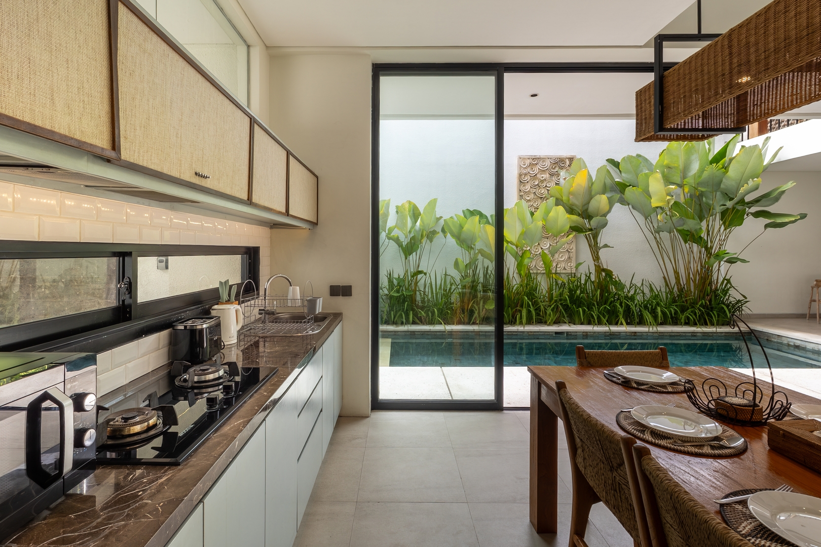 • Fully equipped modern kitchen with sleek cabinetry, high-end appliances & dining area overlooking the pool