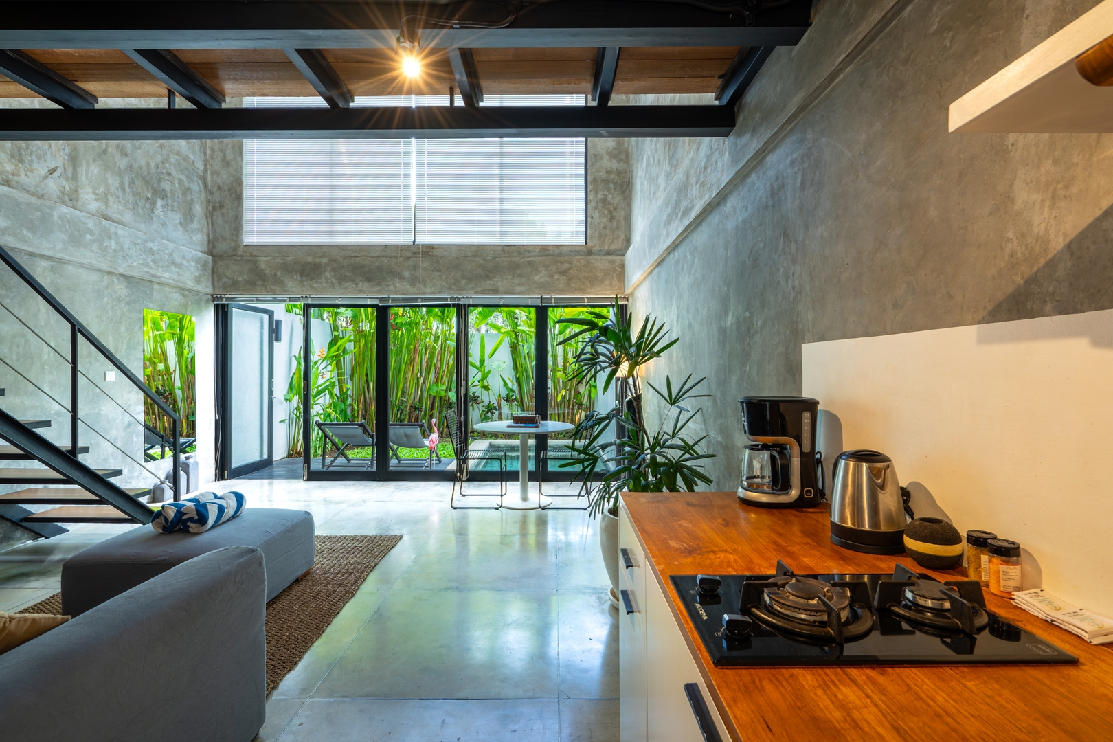 Experience modern Bali living at this industrial-inspired 1BR mezzanine villa in the heart of Canggu. Featuring polished concrete interiors, floor-to-ceiling glass, and a private plunge pool surrounded by greenery, it’s the perfect stay for travelers seeking a bold and stylish escape. • 800 m to Fine by Satu Satu Coffee & Canggu’s café scene • 2 km to Nirvana Wellness, Pilates studios & day spas • Near to Batu Bolong, Petitenget & top beach clubs Fast Wi-Fi & 24/7 guest support included.