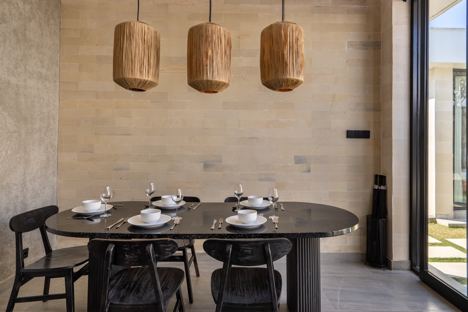 At Solencia Villa, the open-plan living and dining area is designed for connection and comfort. The modular sofa is a comfortable place to unwind after a day of exploring, whether you're reading a book or simply relaxing. The wall and natural textures add a modern yet welcoming touch to the space. Large glass doors let in plenty of natural light and offer a clear view of the central pool and neatly garden, creating a seamless indoor-outdoor experience and spacious feel.
