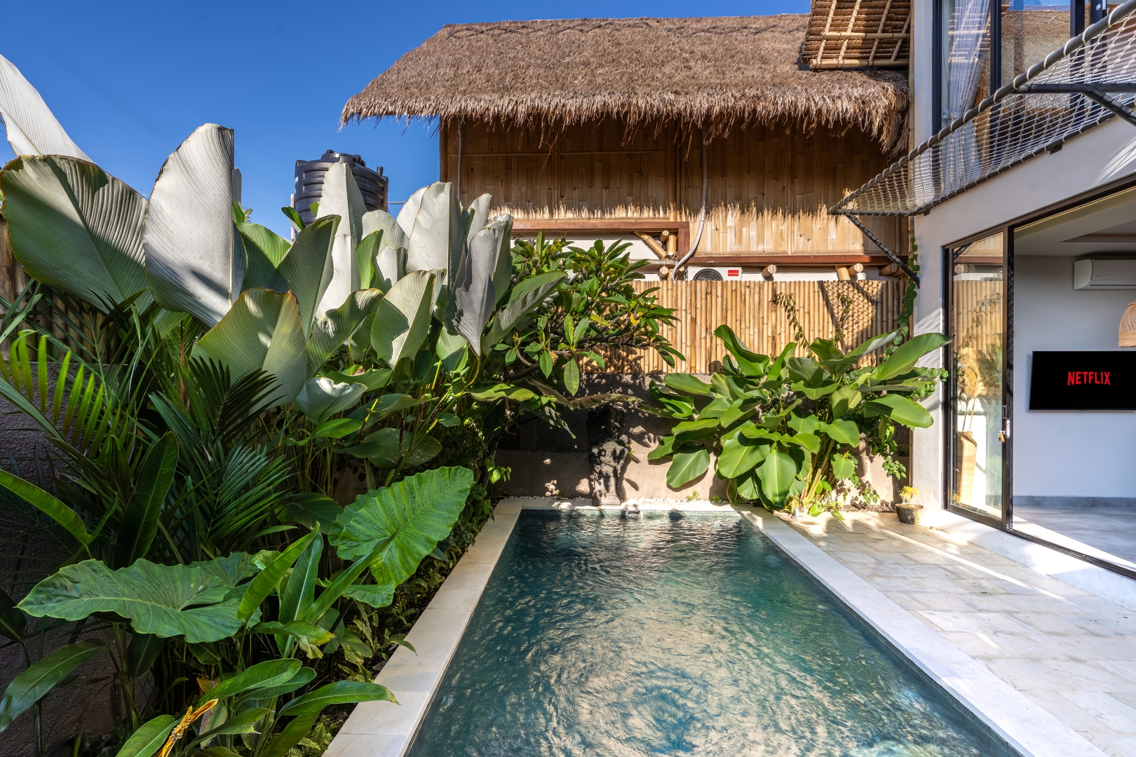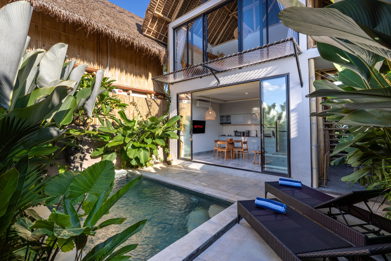 You’ll have full private access to the villa, including the modern ensuite with bathtub on the ground floor, fully equipped kitchen, cozy living area, and tropical-style private swimming pool.