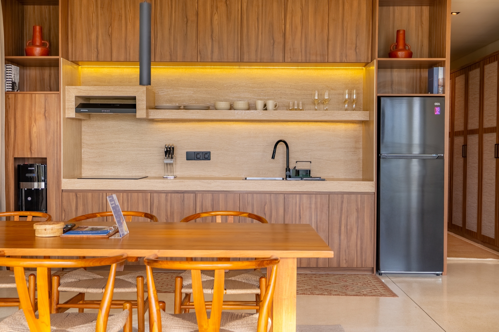 Guests have full access to the entire 1BR apartment, including the sunken living area, modern kitchen, spacious bedroom, ensuite bathroom, private pool with sunbeds, and outdoor patio with a rice field view. The apartment is within walking distance of Village Cafe and just 5 minutes from Paintball Canggu. For any assistance, 24/7 customer service is available. Enjoy your stay!