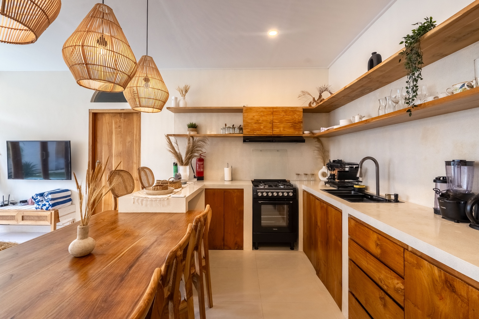 • Fully equipped kitchen with gas stove, refrigerator, open shelving & dining table for six — ideal for shared meals