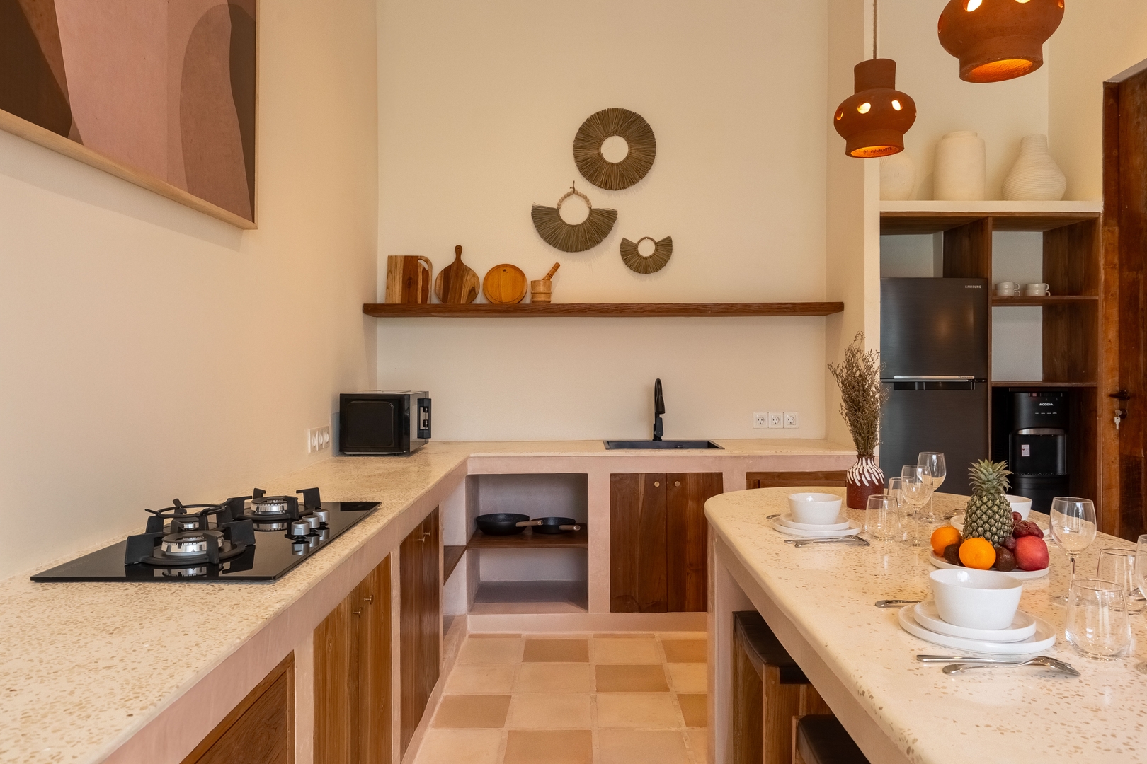 • Open-plan kitchen with premium appliances & natural-wood dining set