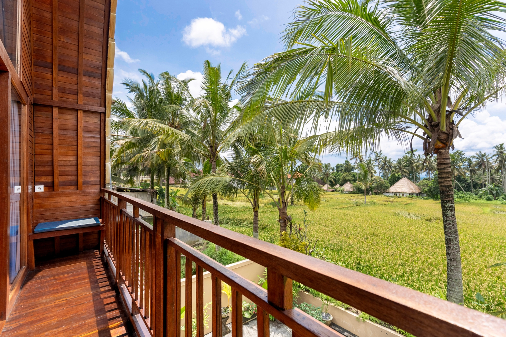 Crafted entirely from wood and elevated for views, Lumbung Mas Villa celebrates classic Balinese design. From its breezy upstairs bedroom with working desk, and overlooks wide stretches of rice fields with lush poolside garden.