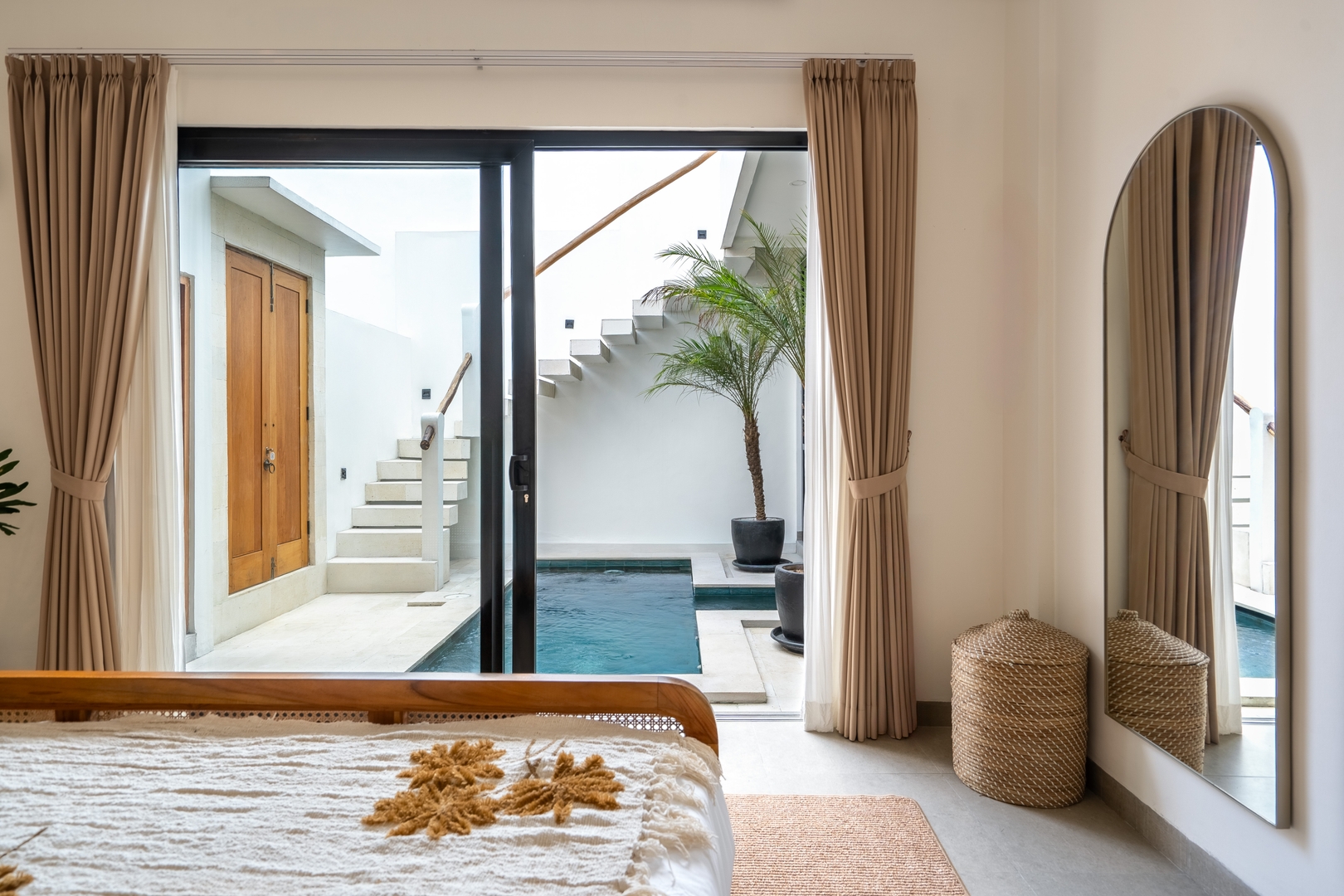 • Spacious bedroom with king-size bed, rattan wardrobe, handcrafted wooden furnishings, and views toward the pool