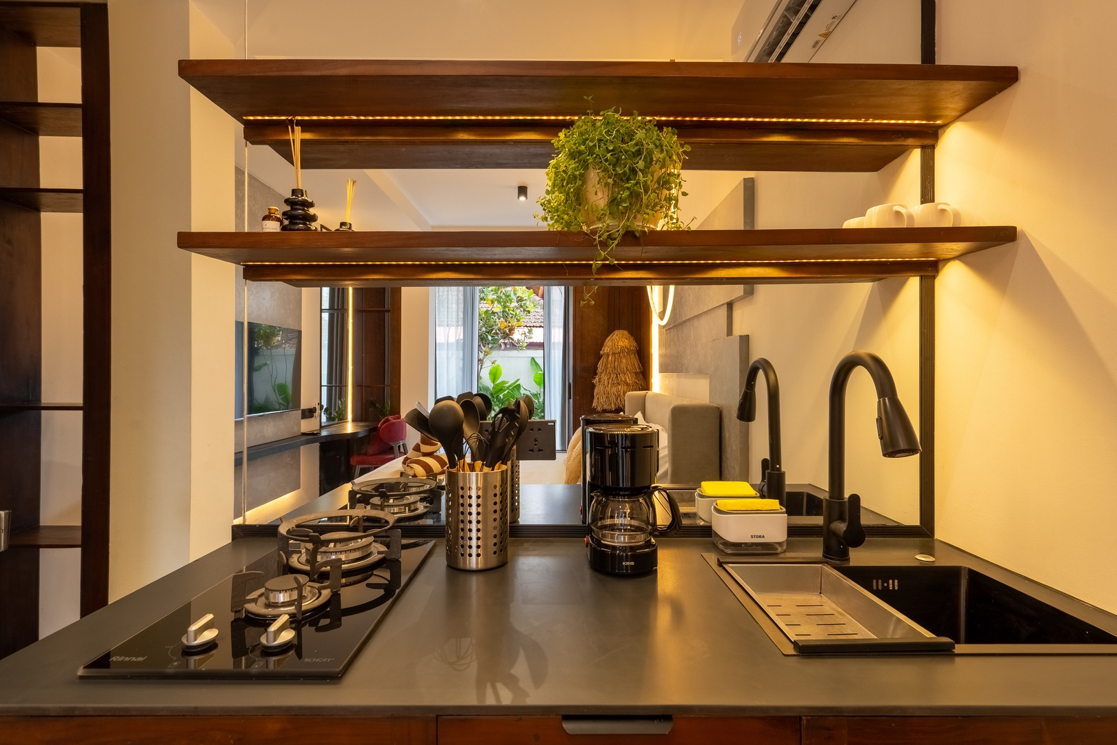 • Compact kitchenette with coffee maker & essentials — convenient for quick meals or morning brews