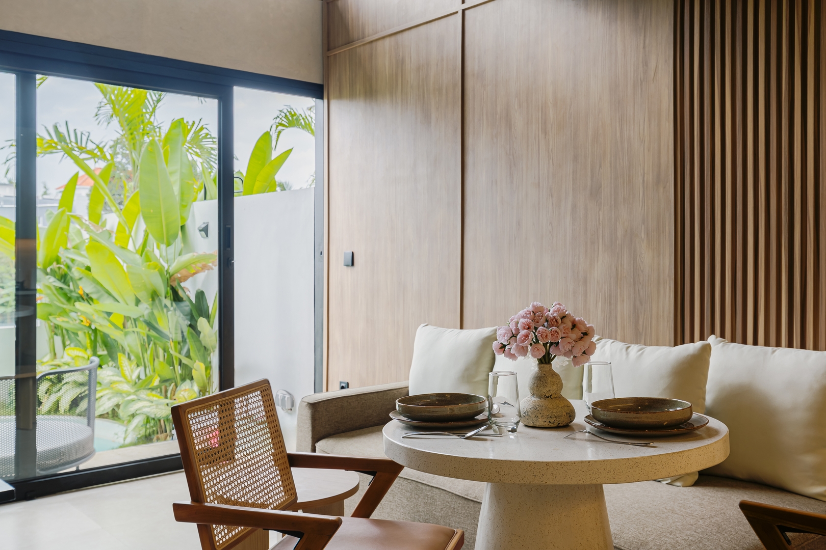 • Bright and airy living area with full-length windows facing the paddy landscape