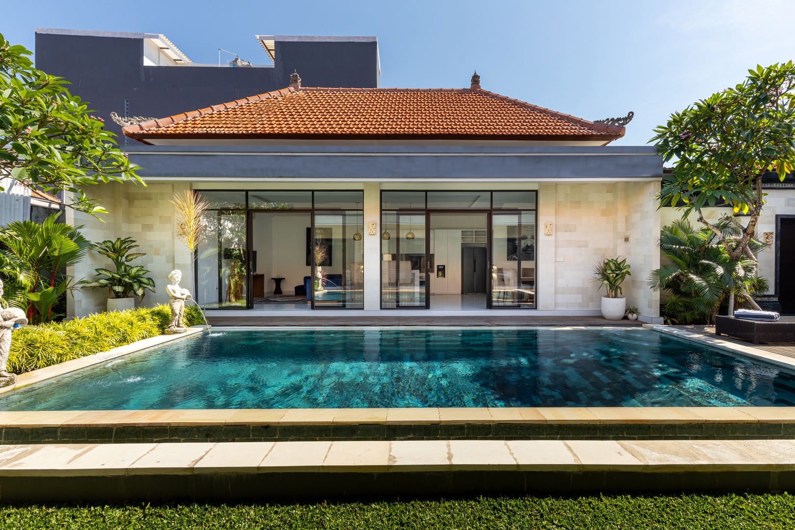 • Three thoughtfully designed bedrooms with wide windows overlooking the pool and garden
