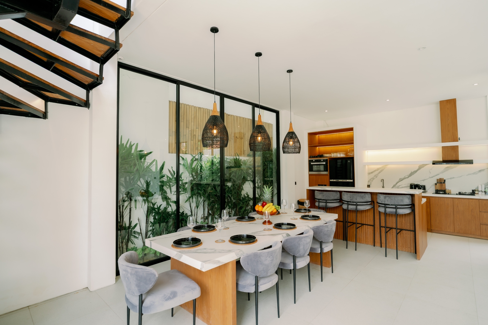 • Fully equipped gourmet kitchen with dining space framed by panoramic garden views — perfect for memorable meals