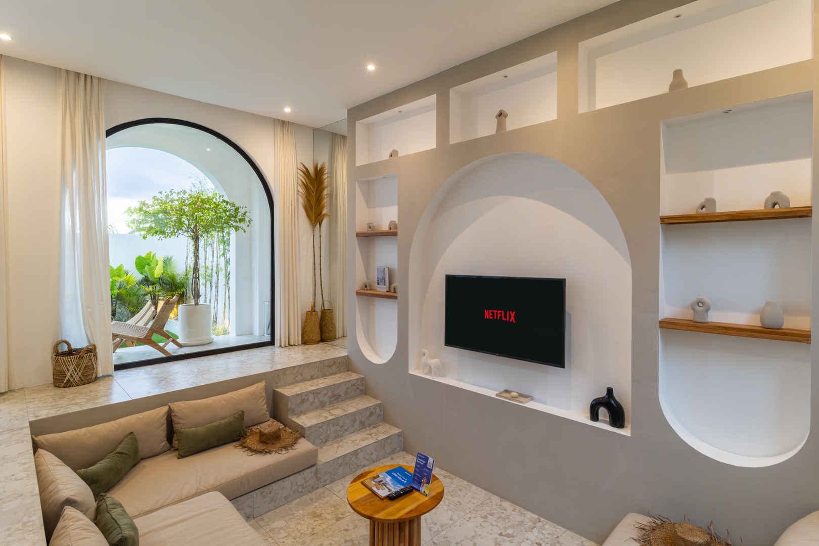 · Sunken living room with smart TV, offering a cozy lounge space with pool and garden views