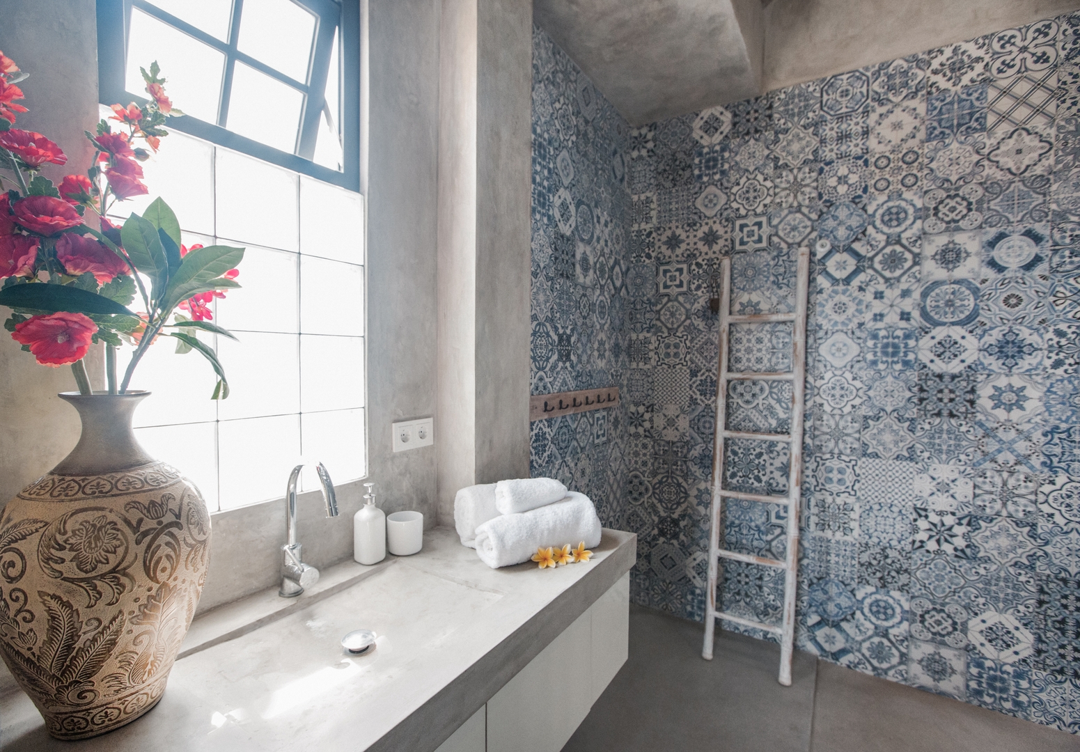 • Private swimming pool framed by tropical greenery & sun loungers—perfect for cooling off after exploring