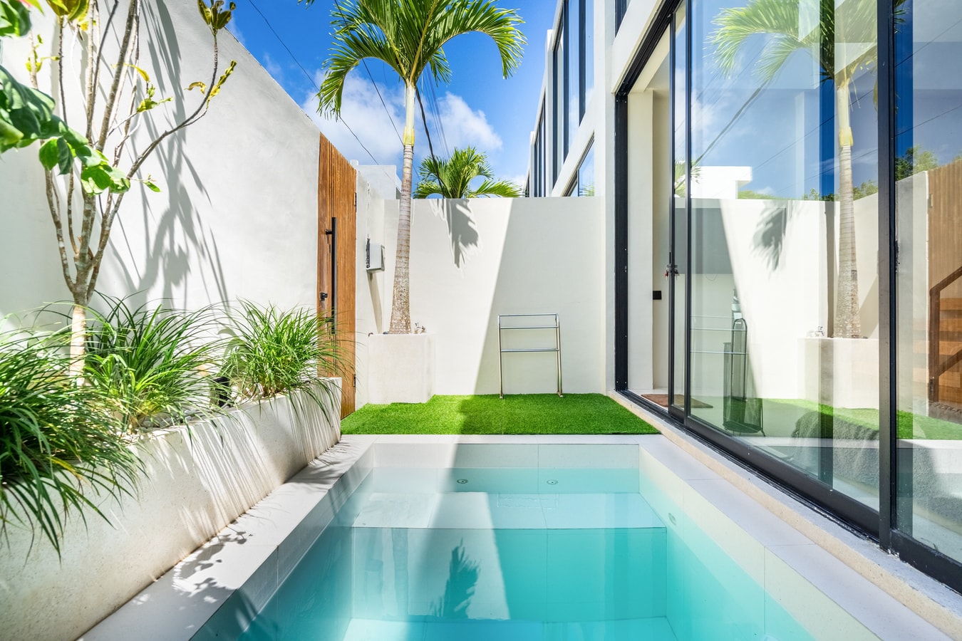 • Private swimming pool bordered by greenery and thoughtful lighting