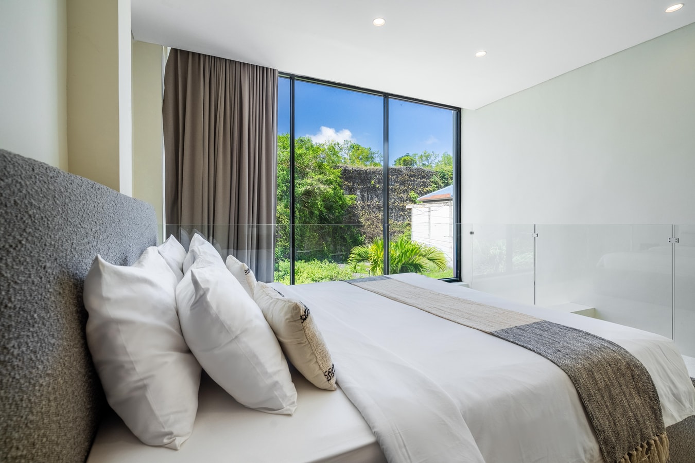 • Upper-floor bedroom with broad windows overlooking greenery hill, pool outlook, and a practical workspace