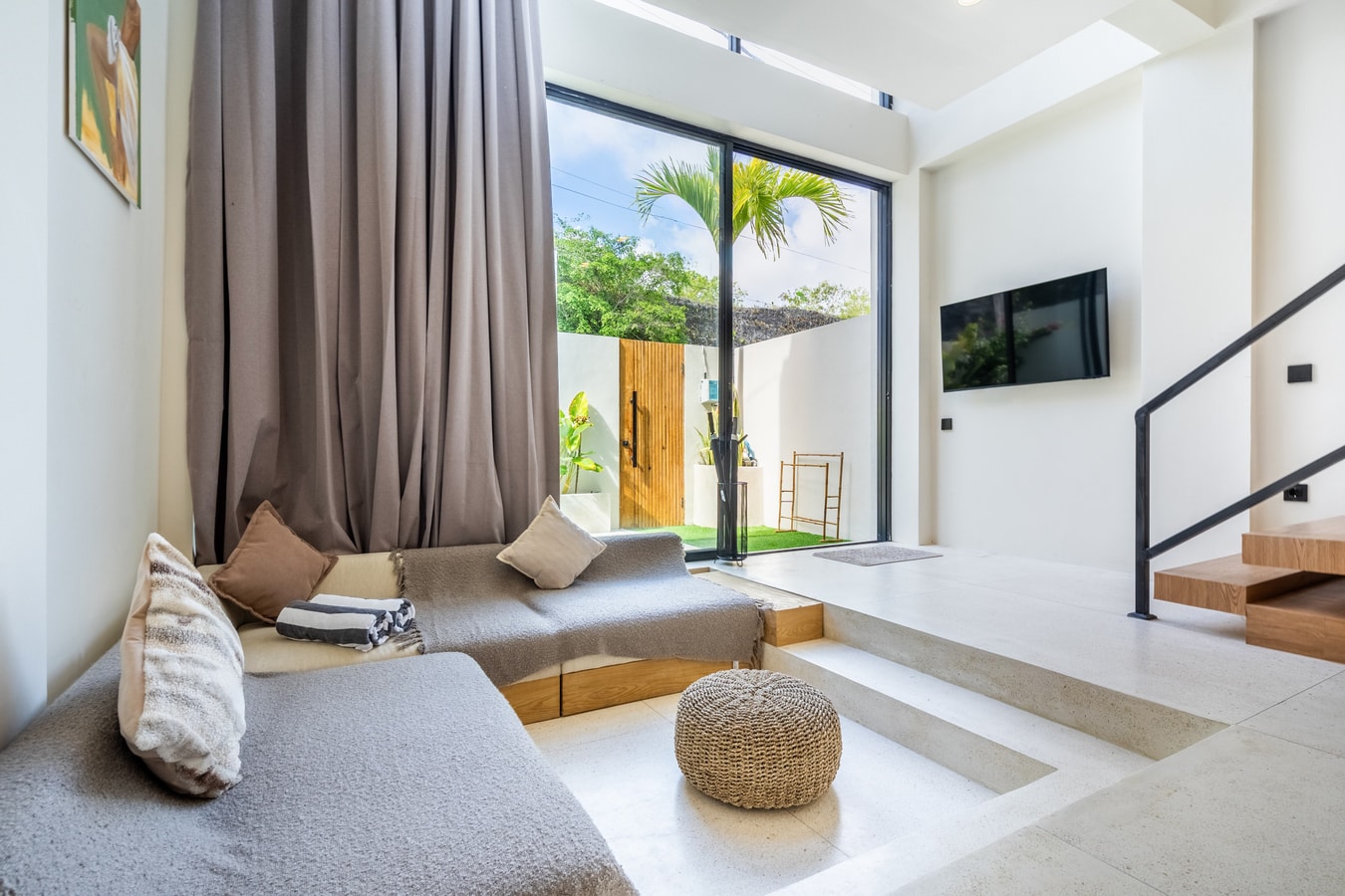 Edem Villa balances modern simplicity with subtle tropical character, resulting in a bright and welcoming environment suited for both short stays and extended trips. High ceilings and broad windows bring in generous daylight, while the open layout ensures smooth movement between each area — from the elevated bedroom to the inviting sunken lounge. Whether returning from Melasti Beach, working remotely, or enjoying a slow morning start, the villa adapts easily to the rhythm of your day.