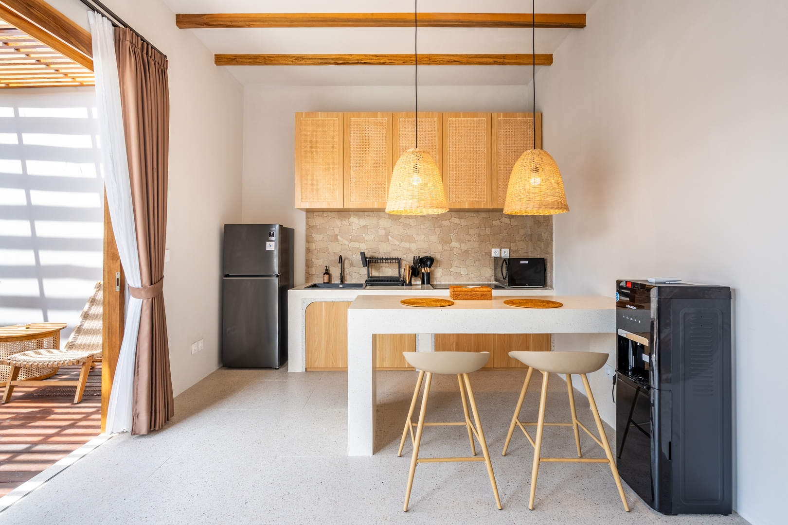 • Fully equipped kitchenette with modern appliances and bar stools — perfect for light cooking and shared meals