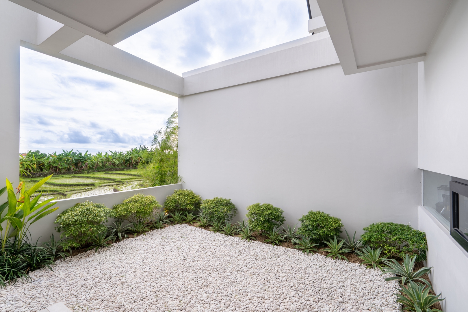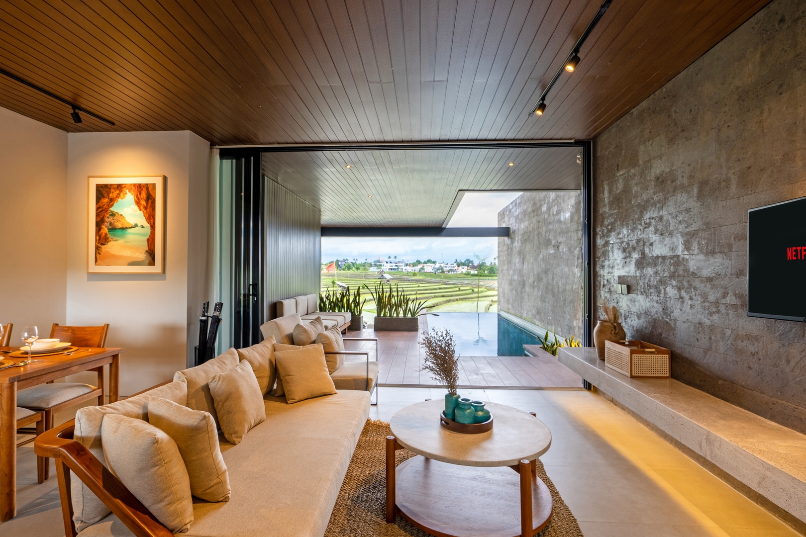 • Open-concept living room framed by oversized glass doors with serene pool & paddy views