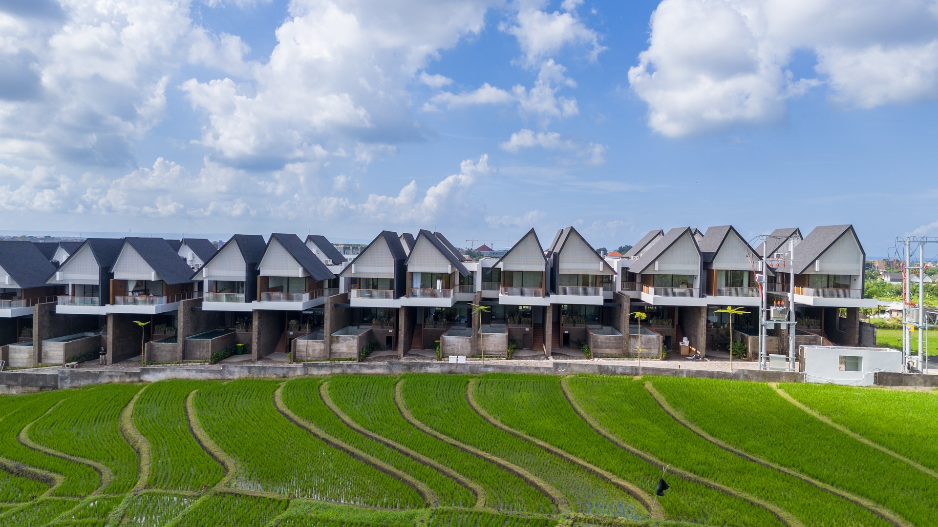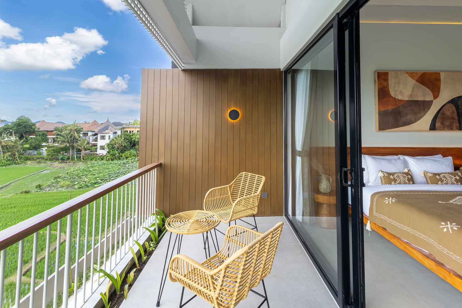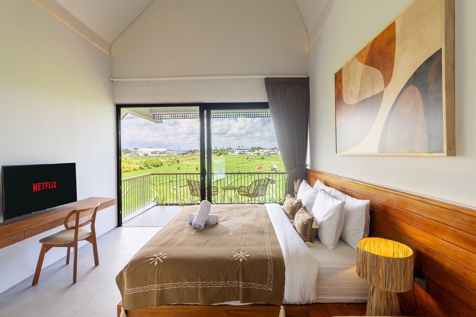 • Stylish open-plan living area with expansive glass doors overlooking the pool & rice-field landscape