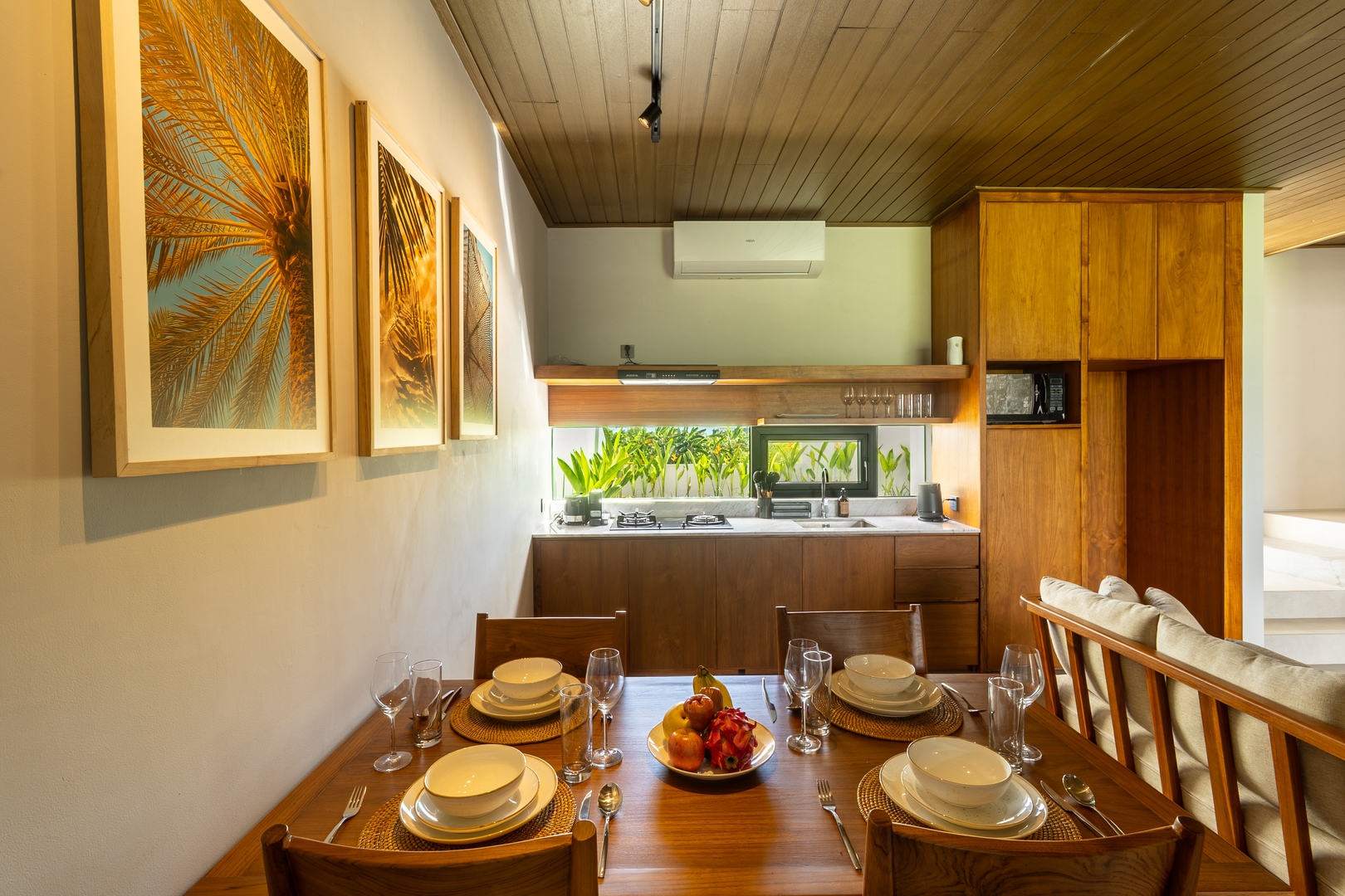 Designed for guests who appreciate refined aesthetics and comfort, Madison Villa delivers a sophisticated atmosphere with airy interiors, elegant finishes, and seamless indoor–outdoor living. Sunlight flows through wide glass doors, revealing relaxing views of the private pool and surrounding paddy views and greenery — creating a beautiful backdrop for leisure, remote work, or extended stays.