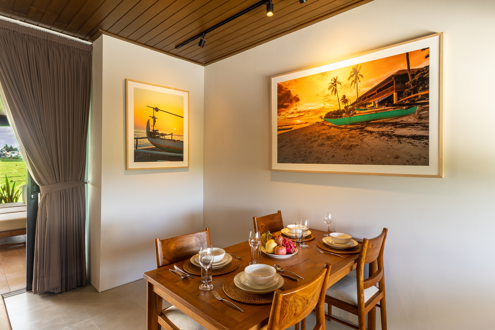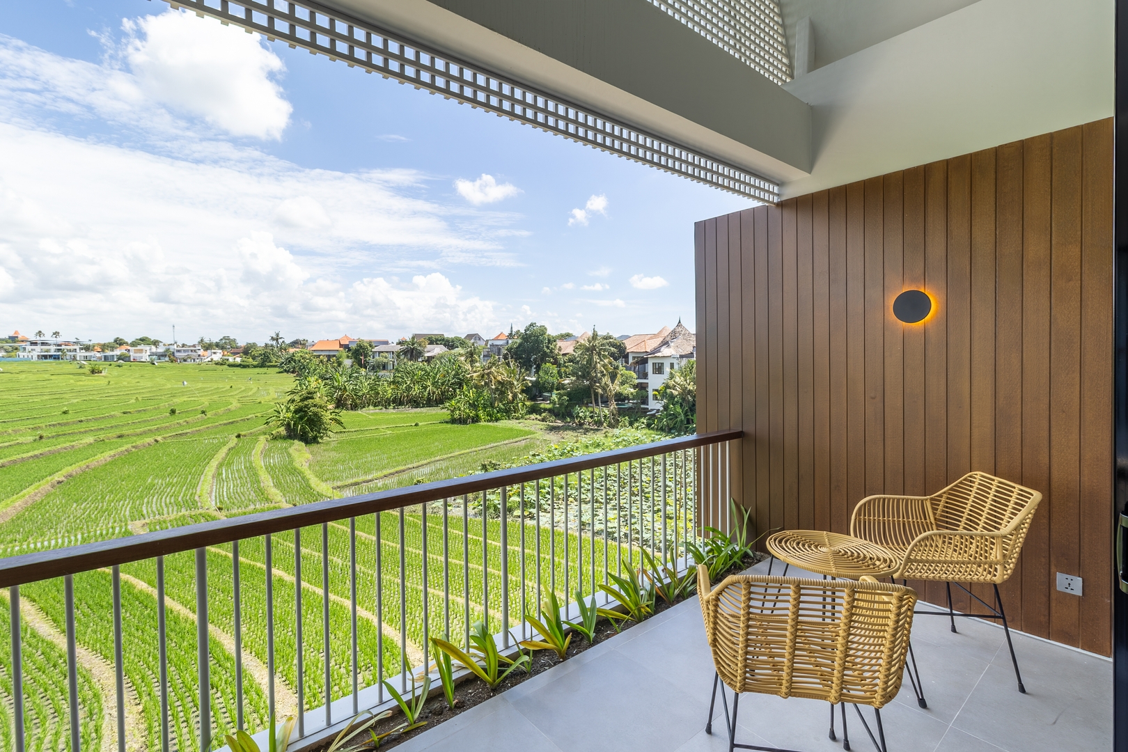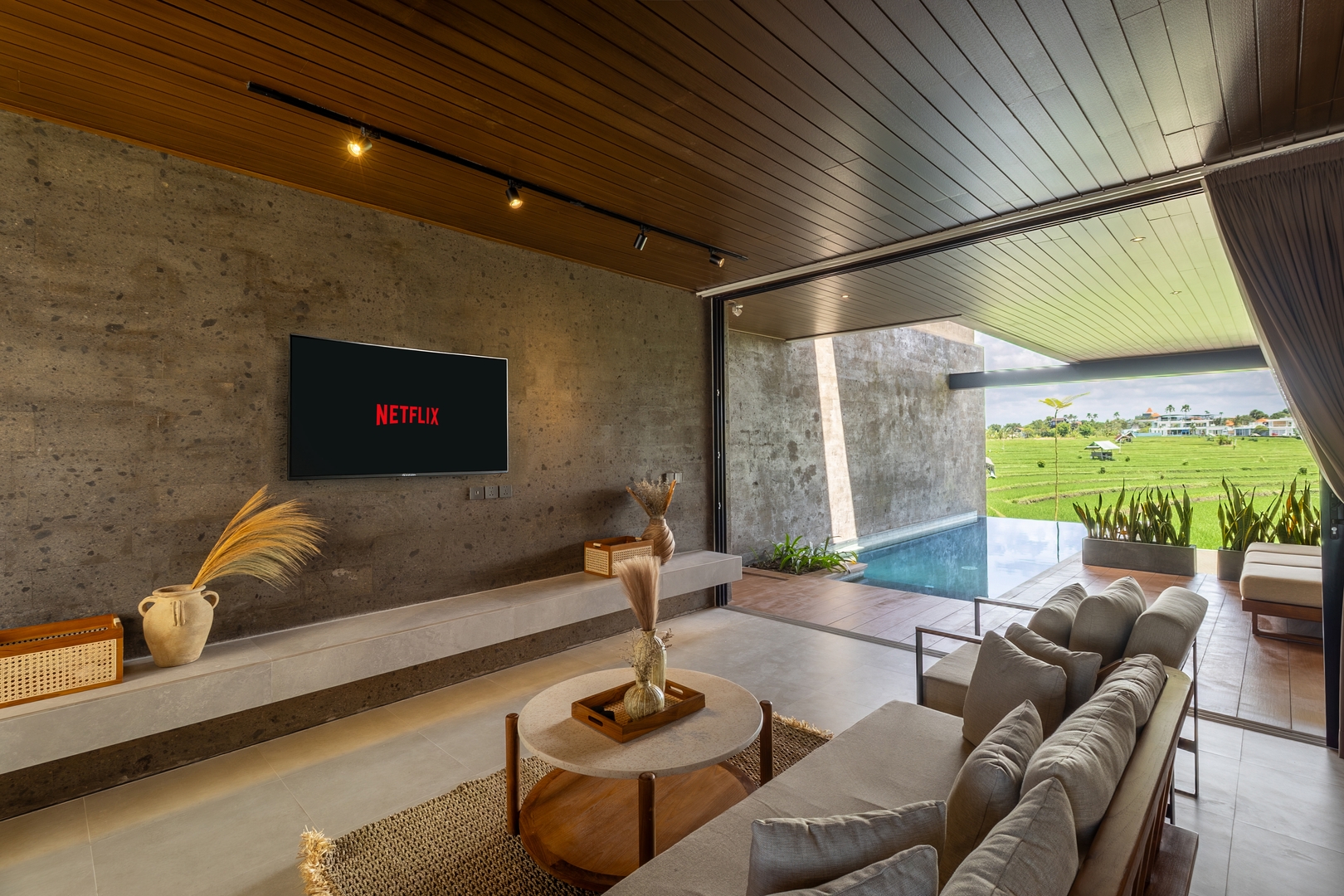 • Elegant open-plan living area with floor-to-ceiling glass doors overlooking the pool & rice-field horizon