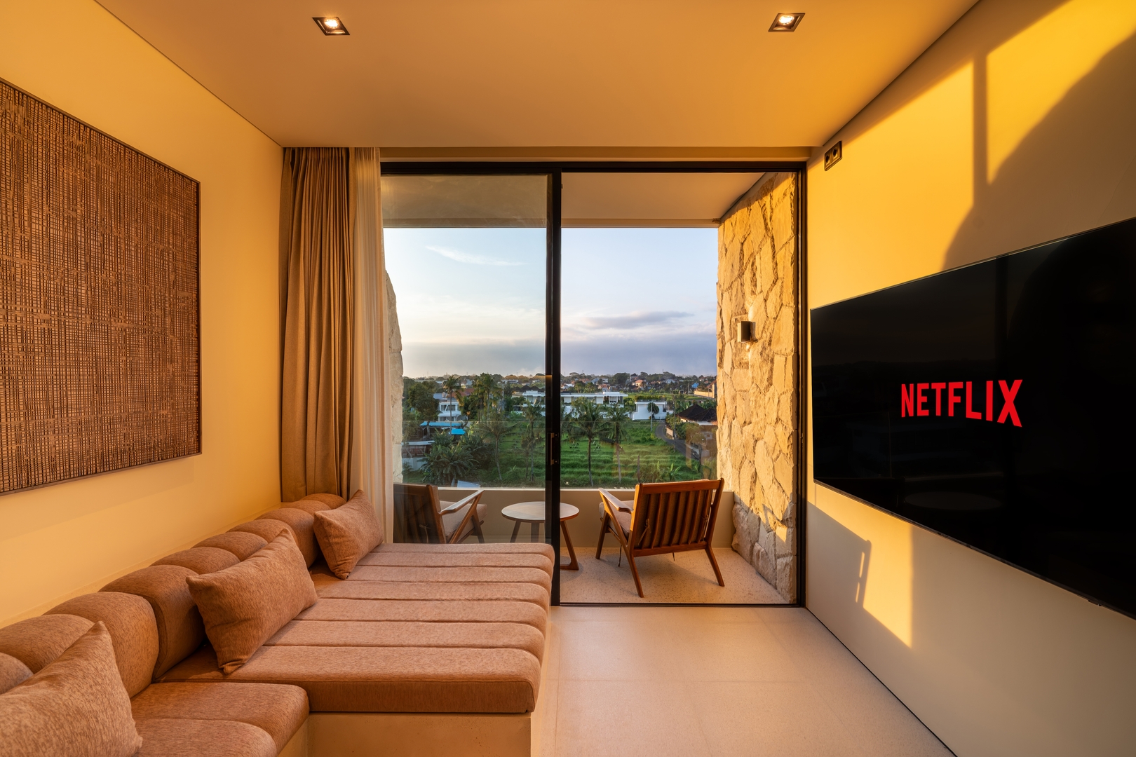 • Living area with sofa, smart TV & sliding doors opening to lush greenery