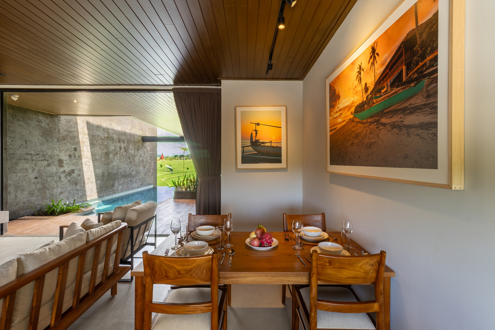 • Open-plan living area framed by floor-to-ceiling glass doors with tranquil pool & rice-field views